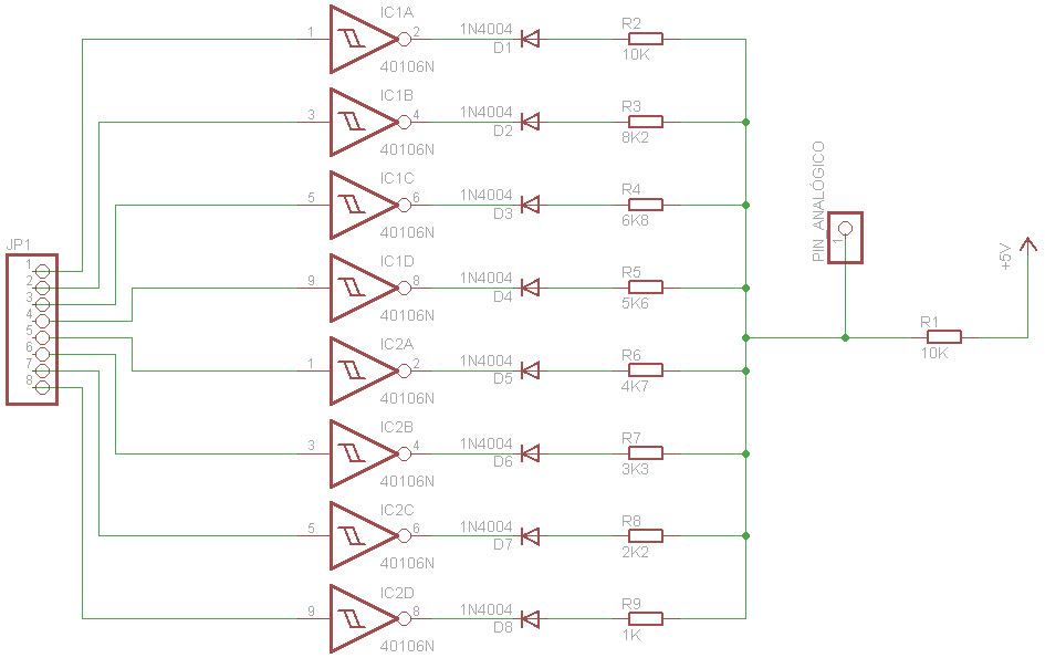 Let me give an example of 8 infrared sensors that distinguish a white background (return value close to 0) and the black line on it (that return a higher voltage). As the Schmitt trigger inverter it can be used a 40106 or 74HCT14 which has 6 inputs / outputs. Since it takes 2 more entries to reach the 8 sensor, another chip inverter is necessary (I recommend distribute 4 + 4 instead of 6 + 2). We also need 8 diodes and 9 resistors.